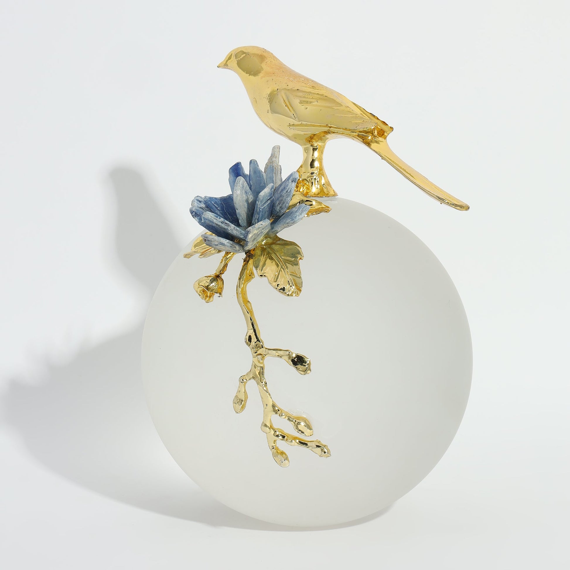 Amara Table Décor—a small yet striking piece designed to elevate your space with understated elegance. Featuring a frosted glass sphere, accented with a delicate chirping metal bird figurine and complemented by vibrant blue selenite stones, this unique creation is a true visual delight.