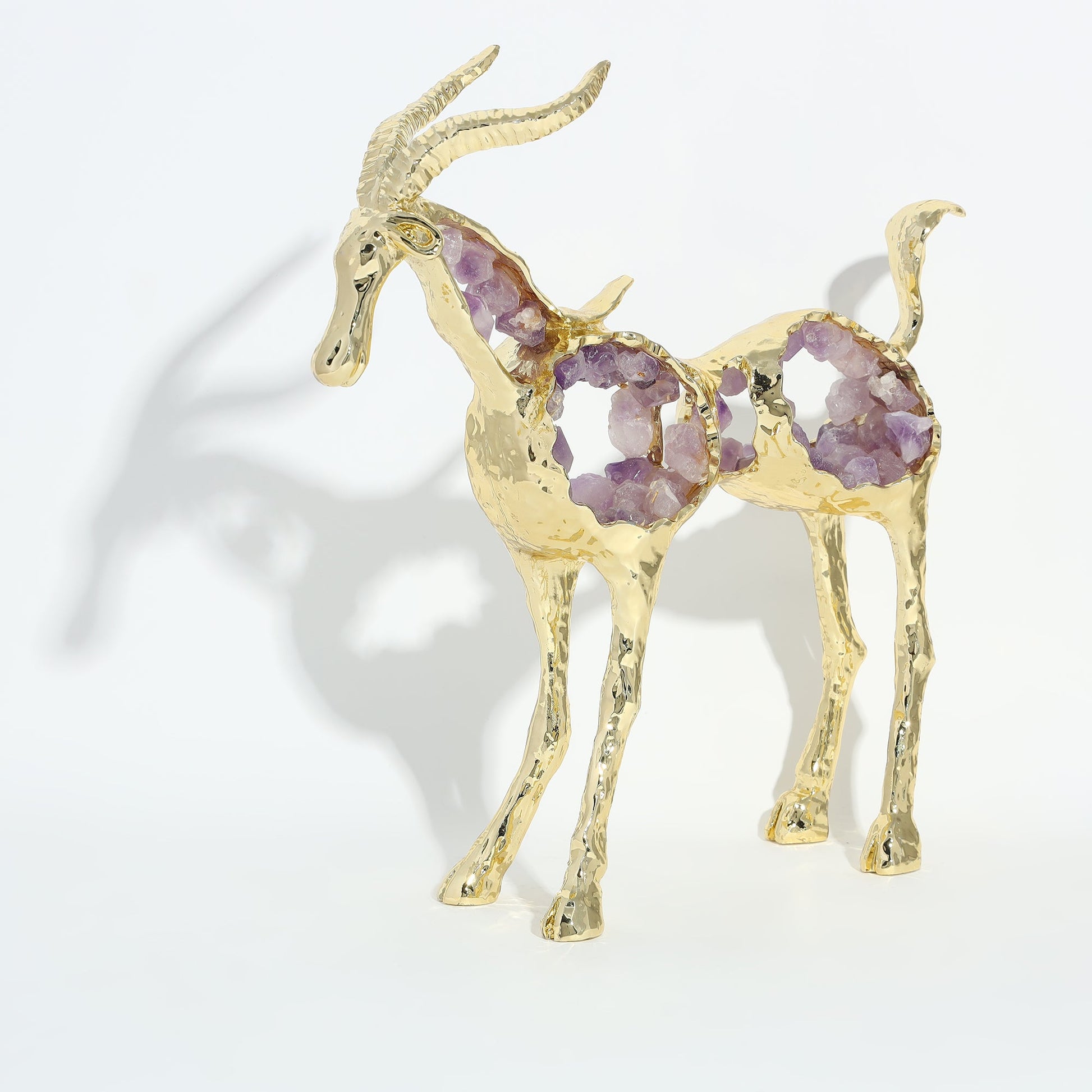 The Antler Sculpture with Amethyst stones is a stunning masterpiece that exudes charm and sophistication, designed to transform your living spaces into a haven of elegance. This grand sculpture features a majestic reindeer captured mid-stride, with intricately detailed horns that add a sense of movement and grace.