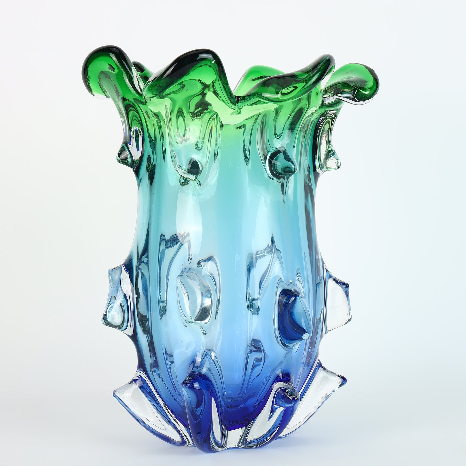 Introducing a masterpiece of design and elegance—a luxurious crystal abstract glass vase that blurs the line between functional décor and artistic sculpture. With its strikingly unique shape and captivating gradient effect, this vase transitions seamlessly from a soft pastel blue at the base to a serene sea green at the top, creating a mesmerizing display of color and sophistication.