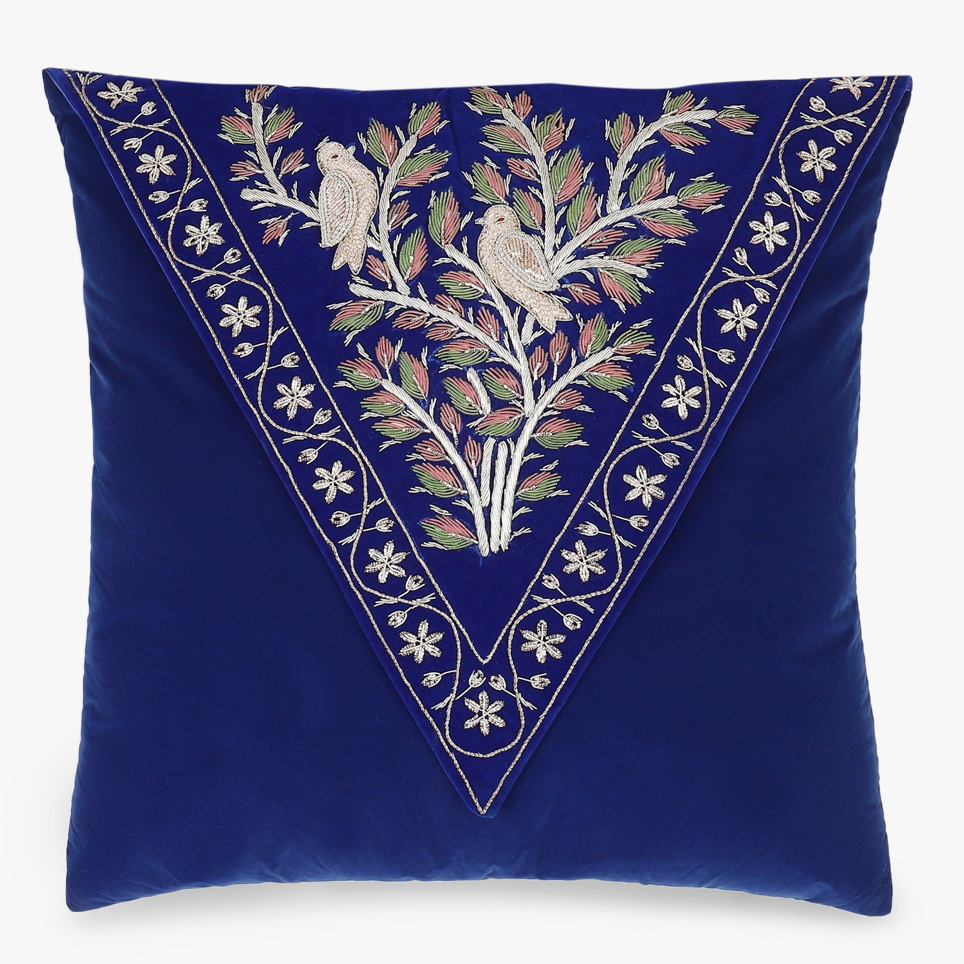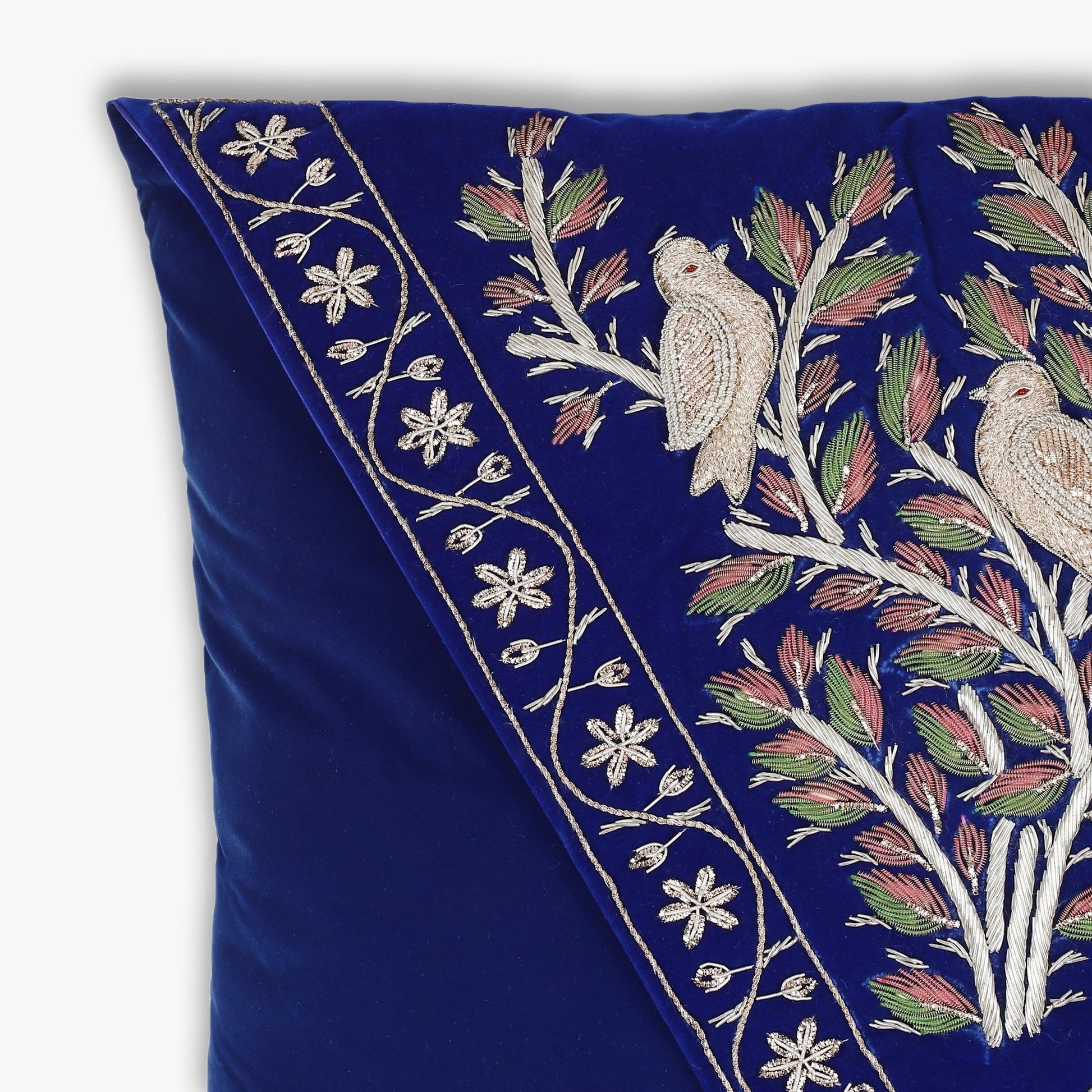 Opulence meets Craftsmanship // the Arq Royal Blue Velvet Cushion Cover is adorned with exquisite and intricate hand embroidered bird motifs. Each piece is a work of art that will transform your space into a palace of elegance and luxury. These exceptional pieces are one of a kind and crafted keeping in mind discerning Connoisseurs of Art, Where Every Piece Tells a Story of Craftsmanship and Beauty. Elevate Your Living Space with Timeless Elegance.