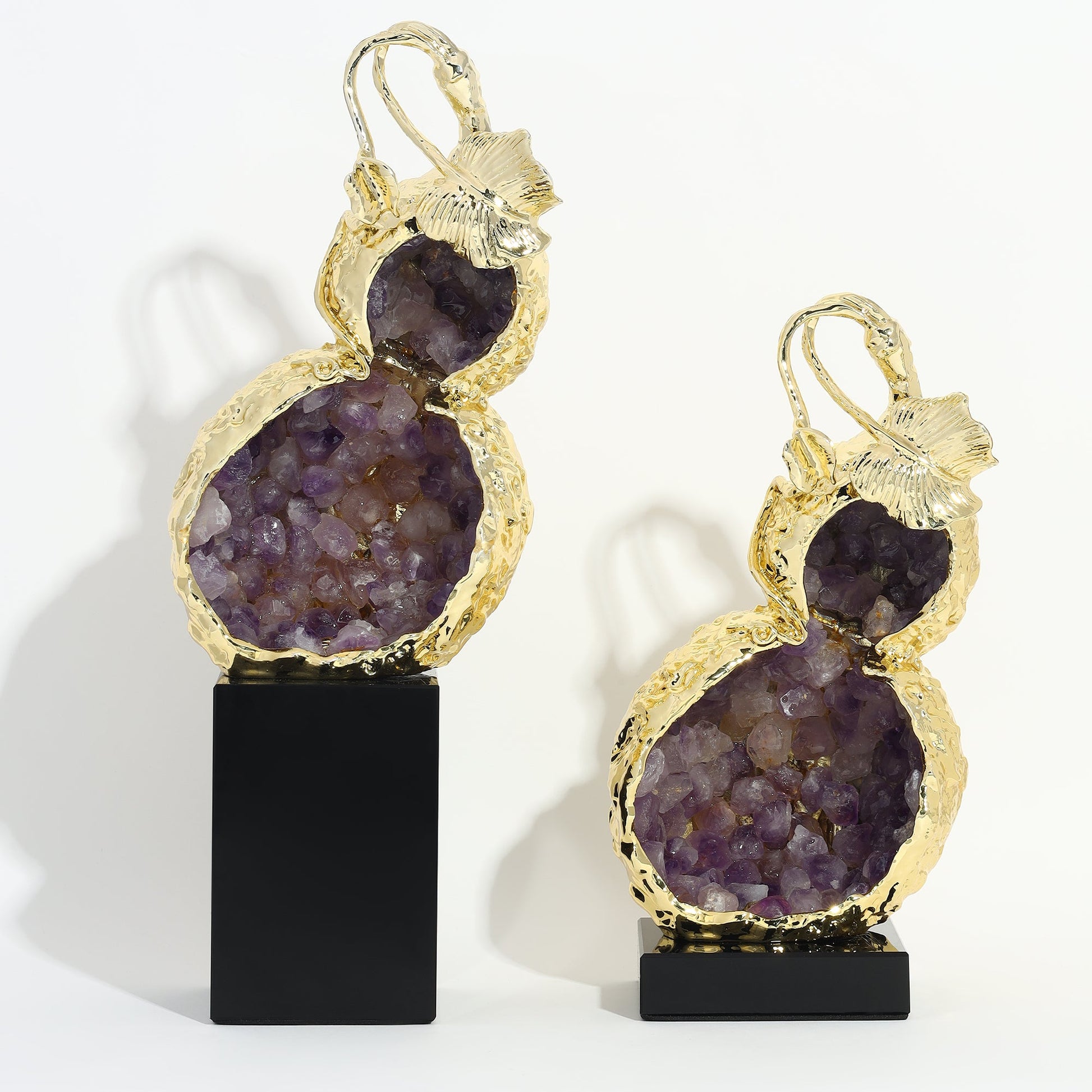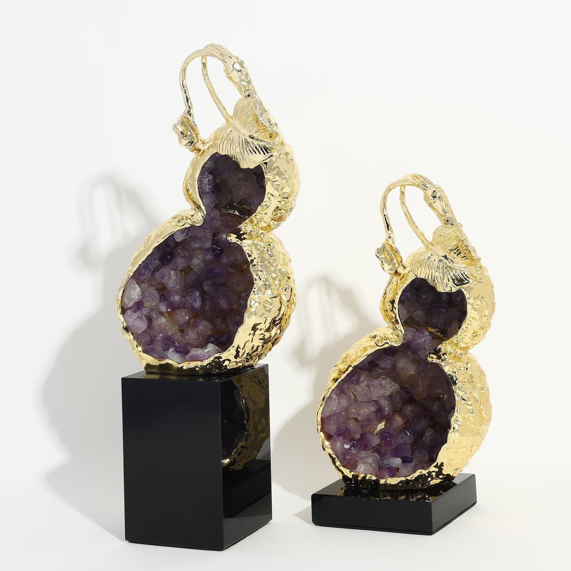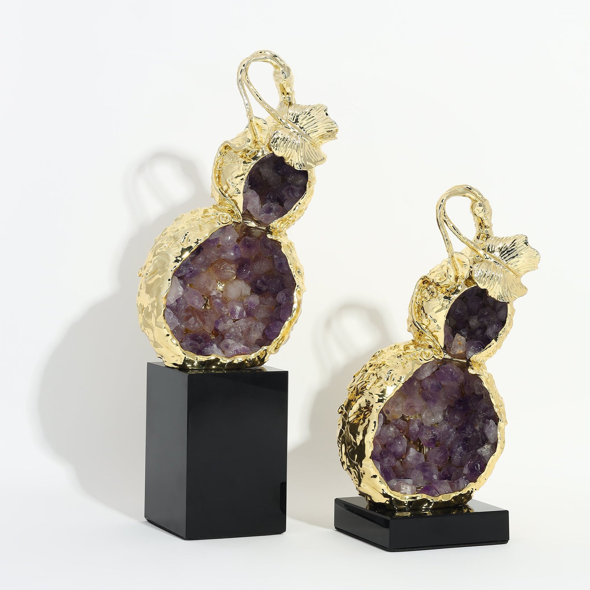 Elevate your living spaces with an air of sophistication and serenity through this exquisite set of two home décor sculptures, masterfully crafted from semi-precious amethyst crystal. Each piece showcases the timeless beauty and intricacy of natural stone, radiating a sense of luxury that is truly unmatched.