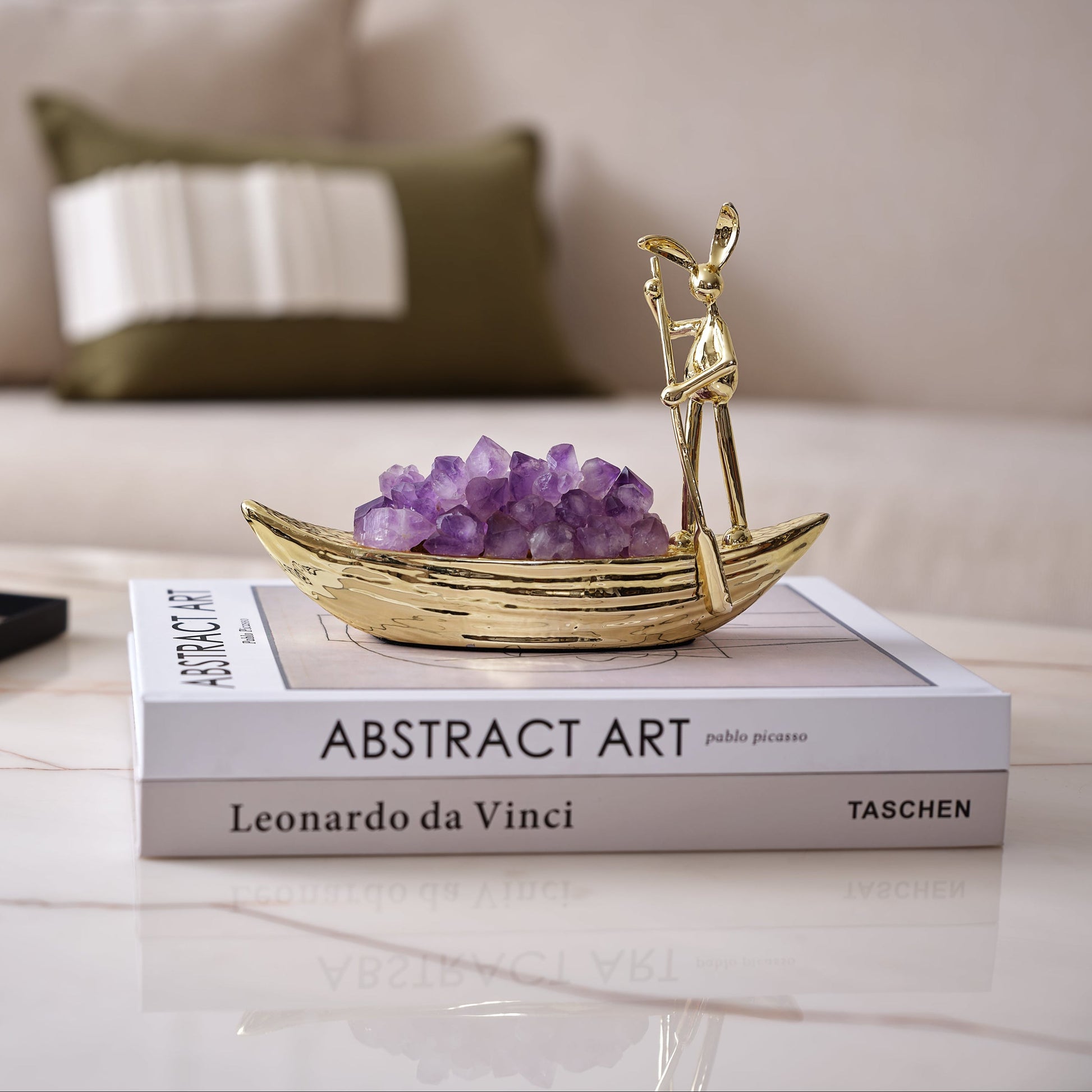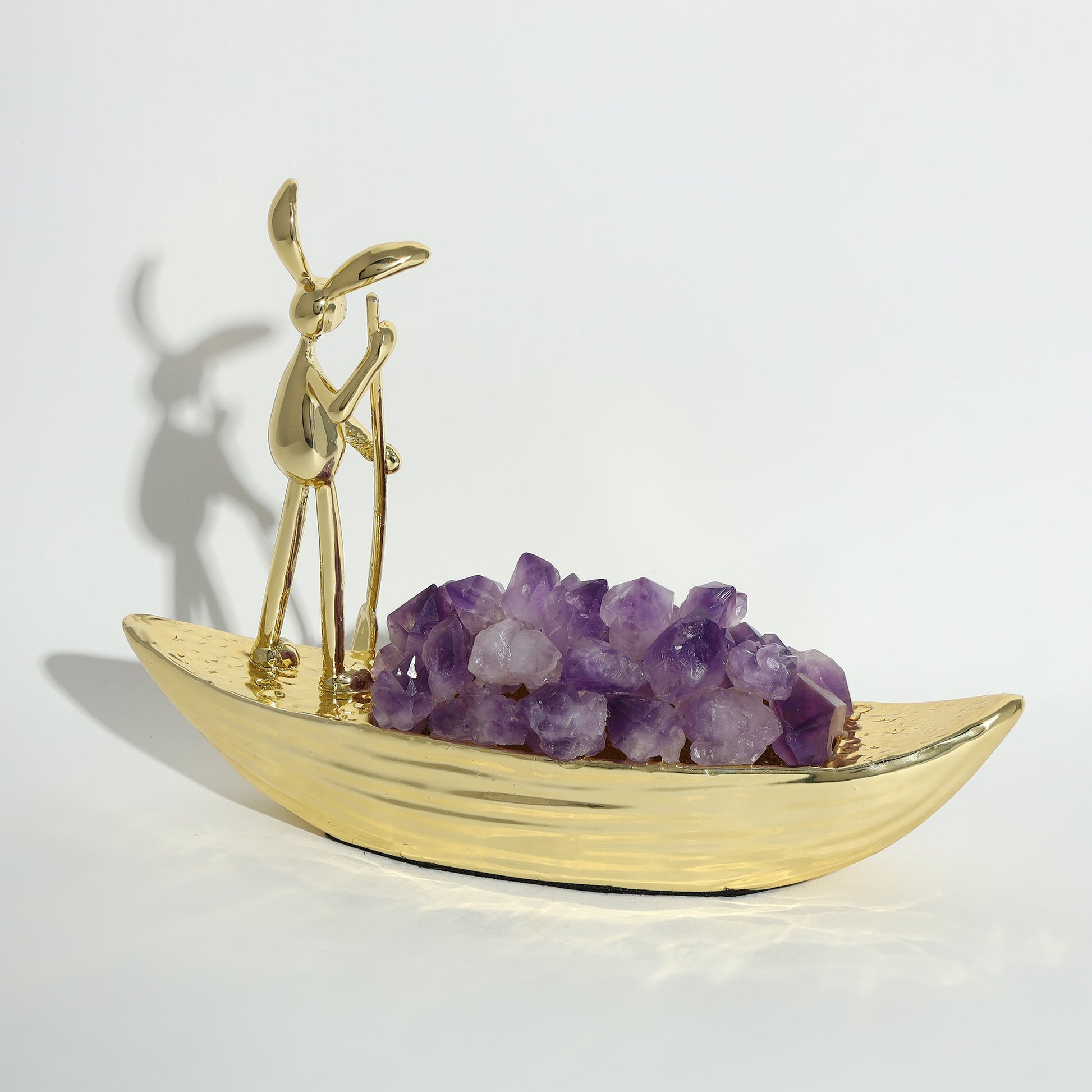 Introducing a delightful fusion of whimsy and sophistication—the Baron Amethyst Sculpture. This charming décor piece features a playful rabbit rowing a boat, elegantly filled with radiant amethyst stones. Its unique design strikes the perfect balance between lighthearted quirkiness and refined luxury.