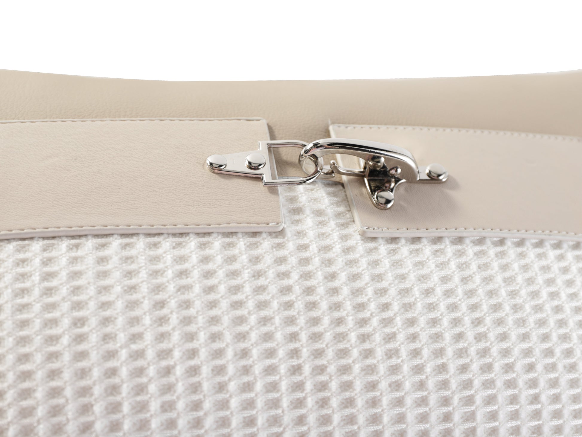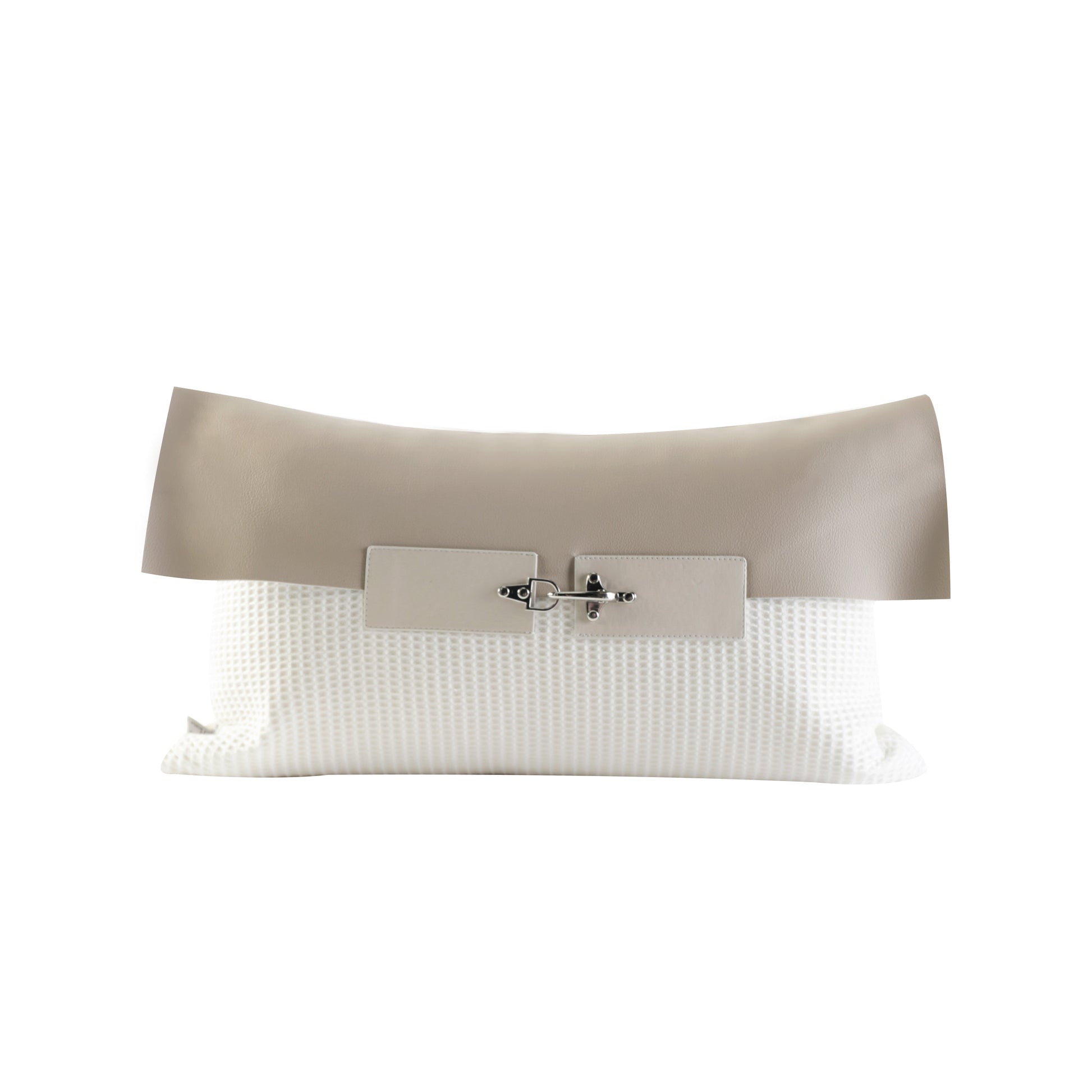 Impeccably crafted in a soothing palette of soft taupe and ivory, this cushion cover pairs rich textures with clean structure for a look that is both contemporary and timeless. The understated waffle weave is beautifully contrasted by a buttery faux leather flap and elegant metallic hardware, evoking a sense of understated opulence.