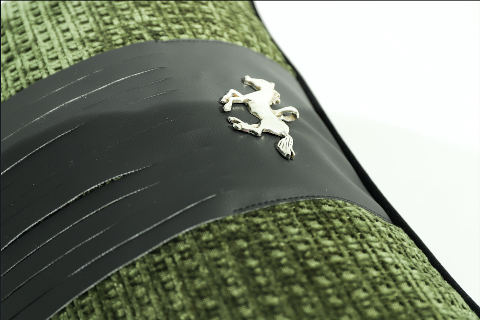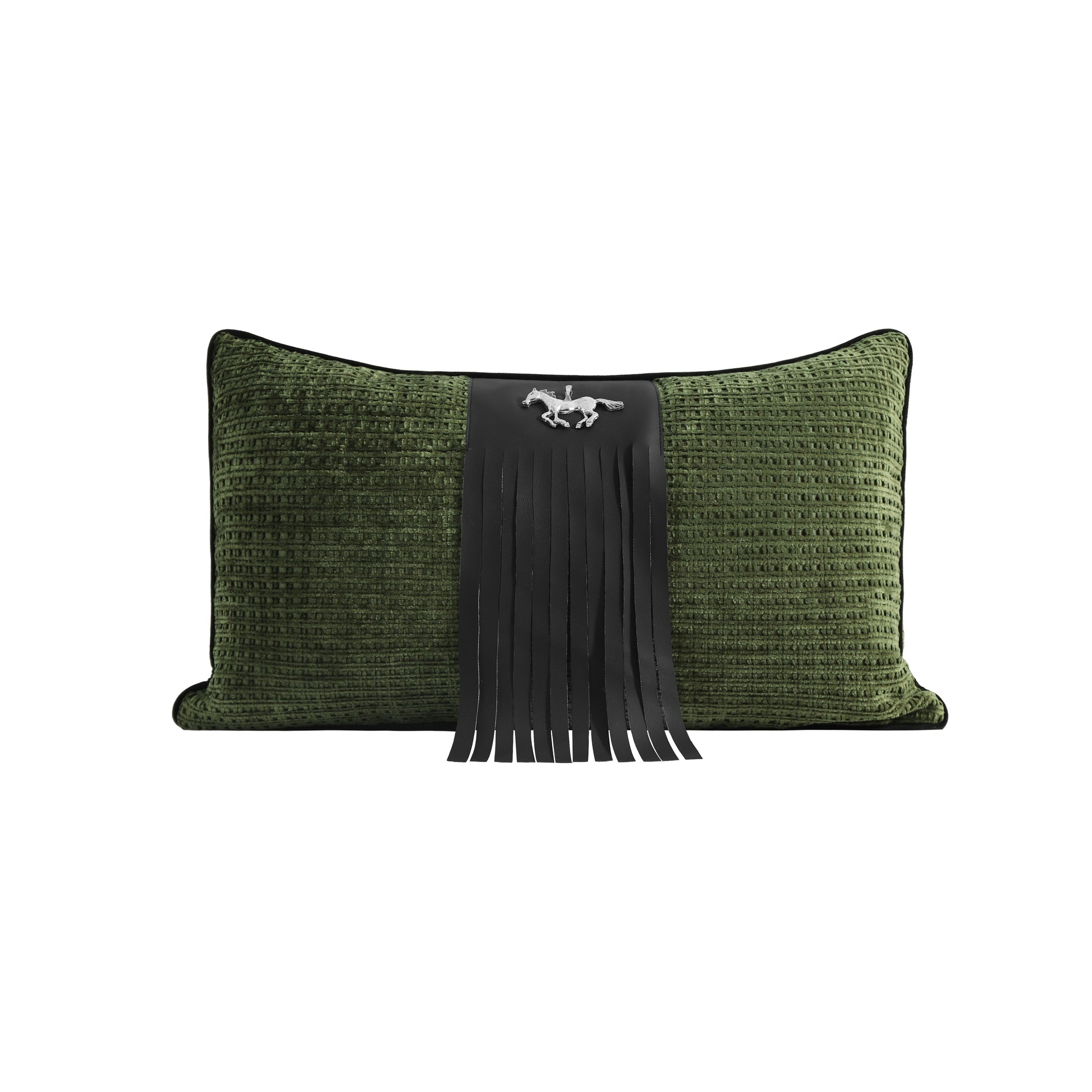 A striking blend of rich olive green velvet and deep black PU fringe, Birch is a modern nod to equestrian elegance. At its center, a silver galloping horse emblem adds movement and character — evoking strength, freedom, and craftsmanship.
