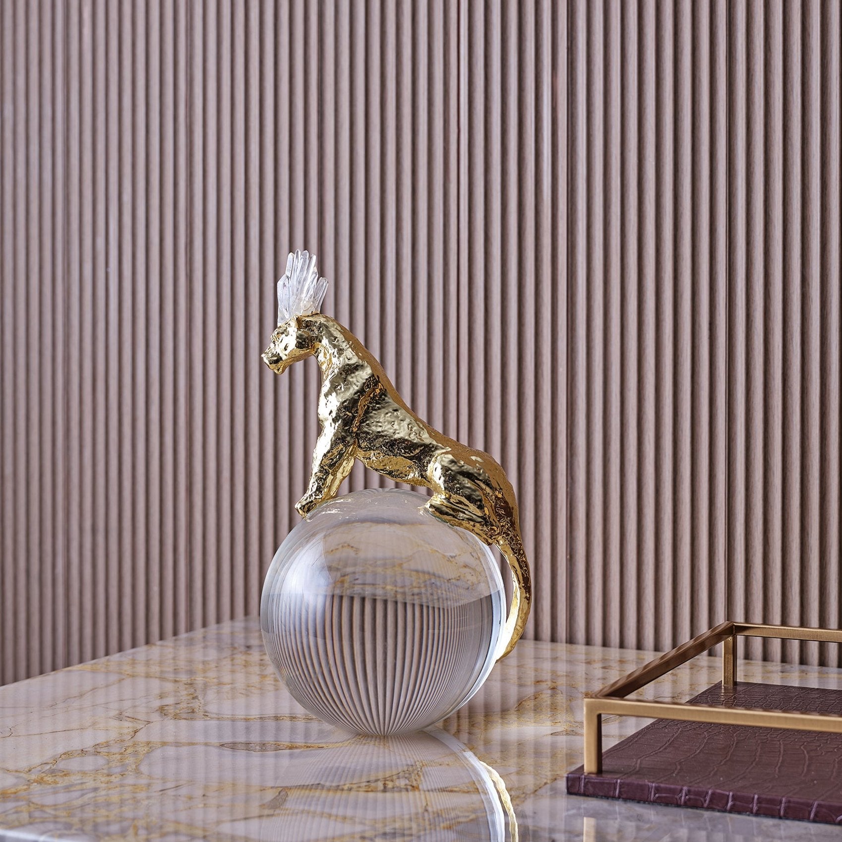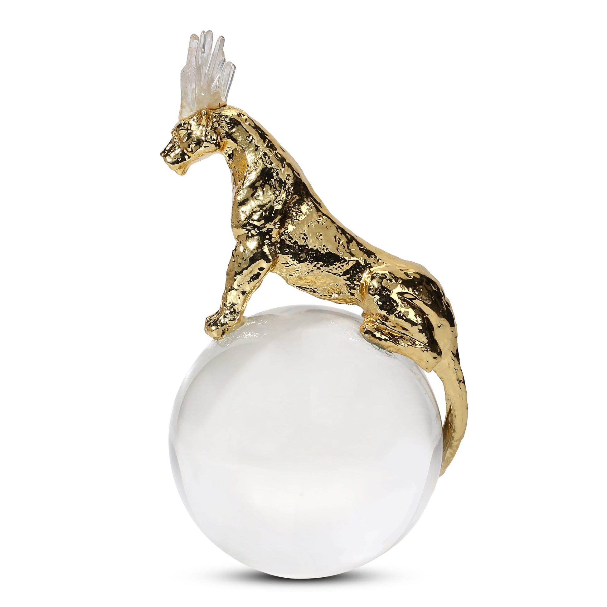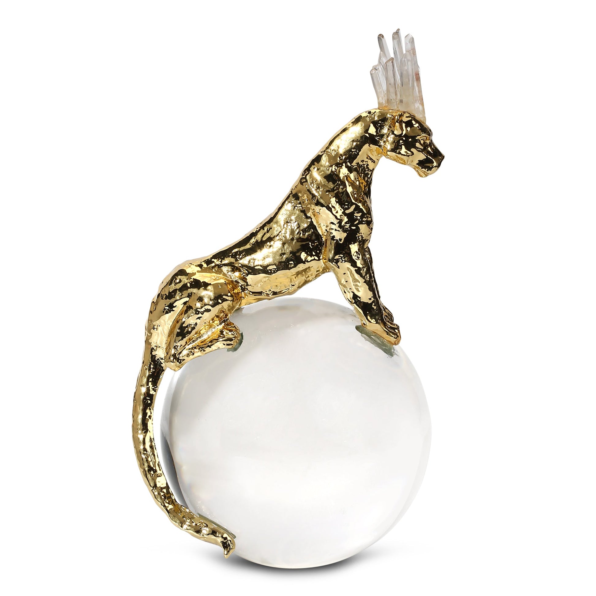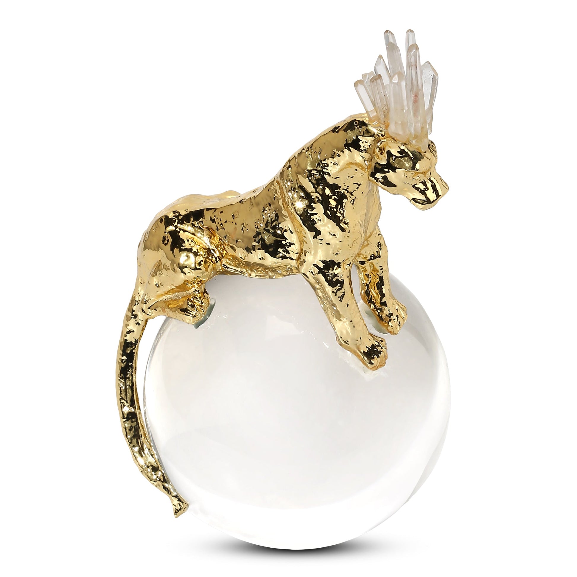 Unleash the Majesty - introducing our exquisite Cheetah Crystal Ball Sculpture, a symbol of opulence and sophistication for your living space. This stunning piece combines the allure of a crystal ball as a luxurious podium for a regal cheetah figurine, adorned with semi-precious quartz stones that shimmer with elegance. Let this captivating masterpiece elevate your home decor to new heights of grandeur and grace and make a statement of refined beauty.