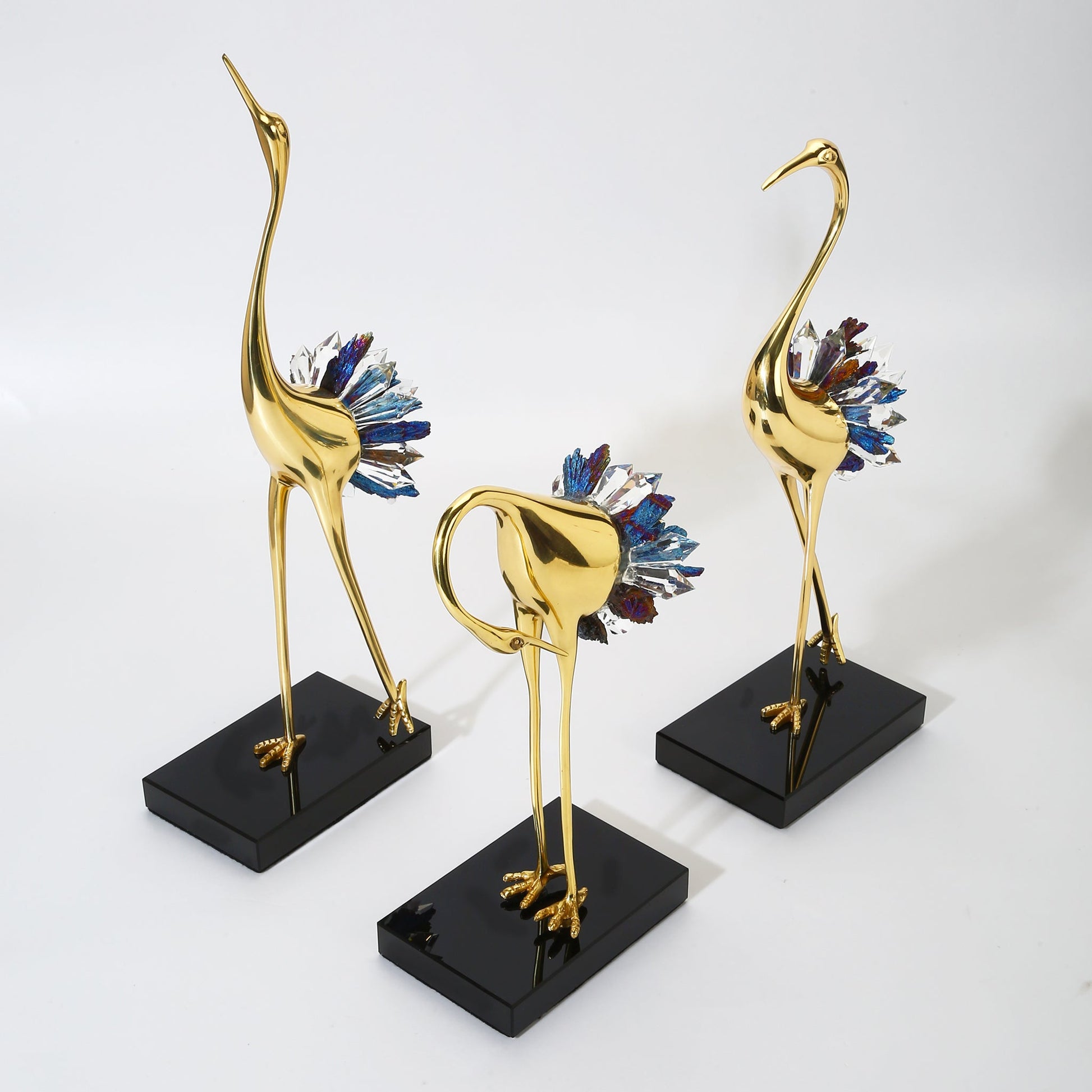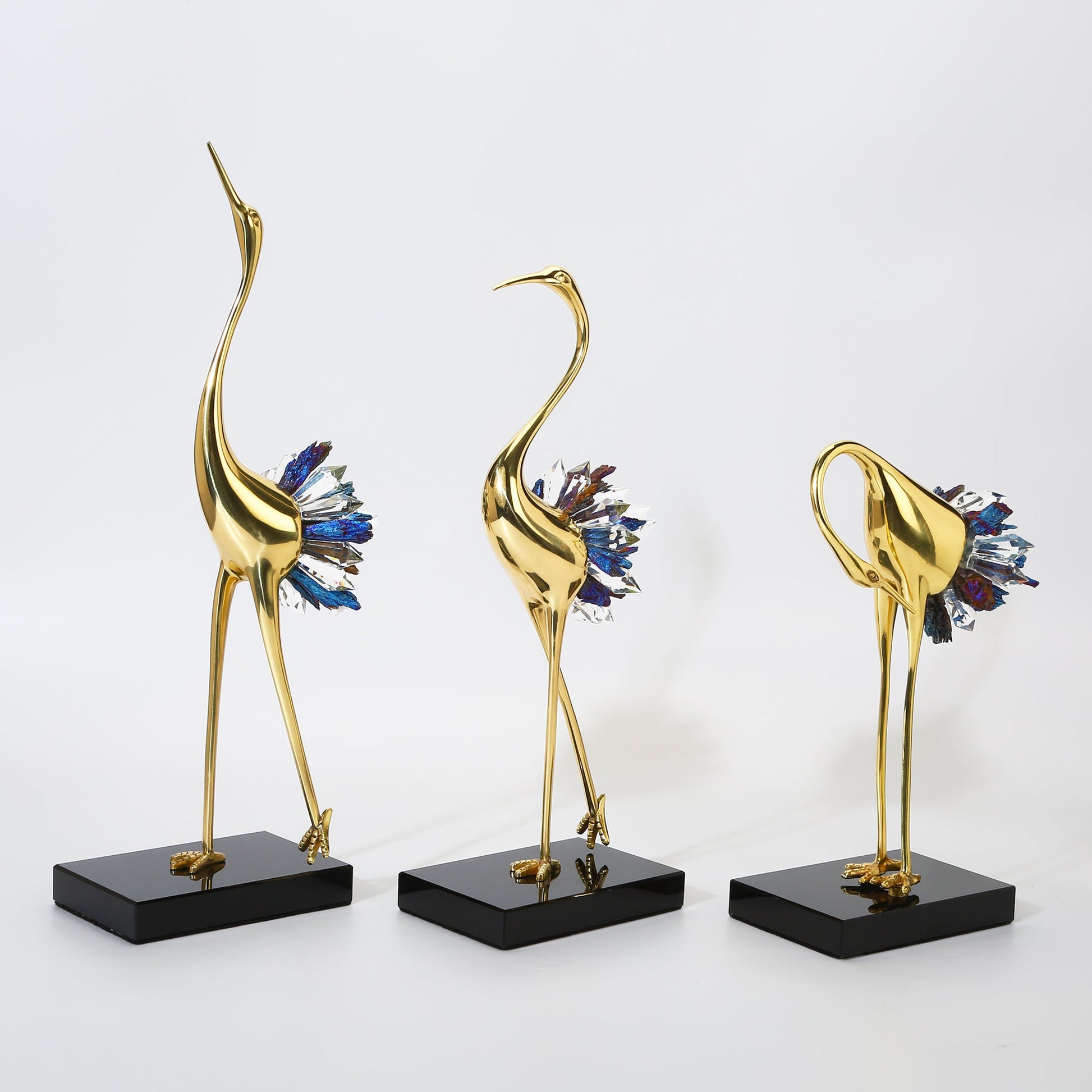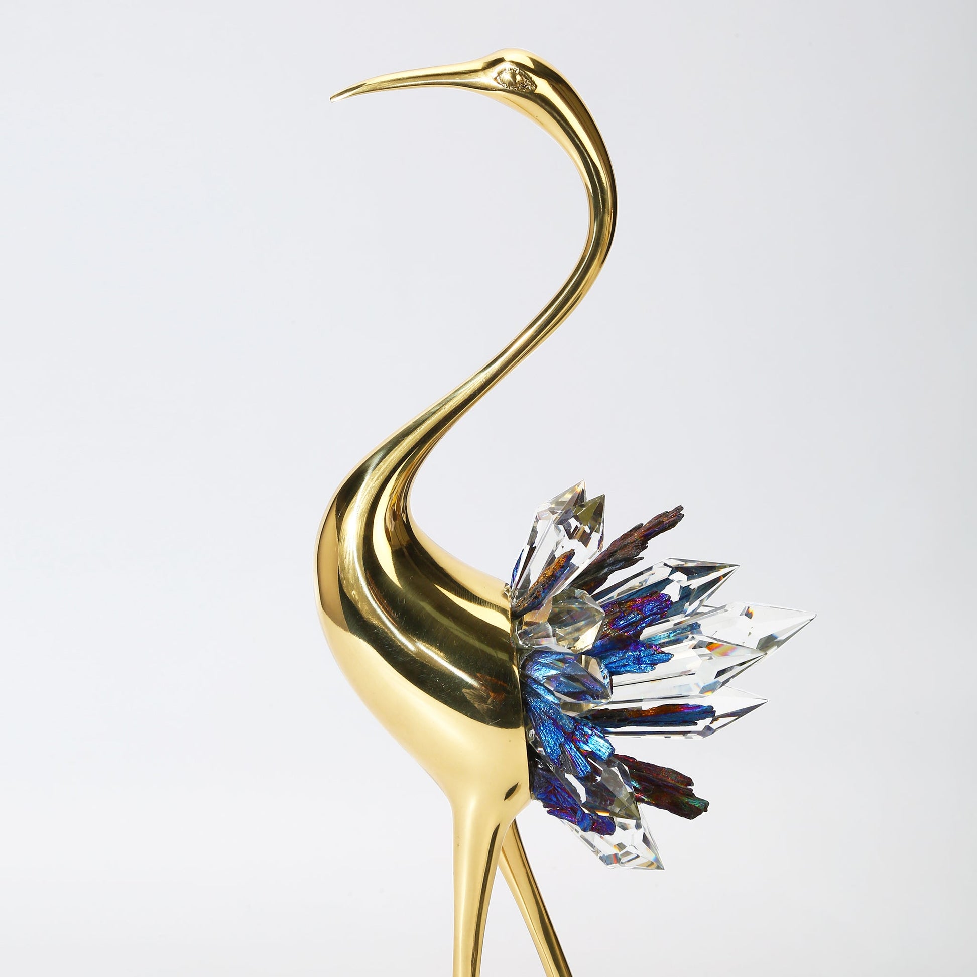 Designed to elevate any space with their impeccable craftsmanship and timeless beauty. Each piece is a true work of art, meticulously cut and polished to perfection. The intricate details and vibrant colors of these flamingos are sure to captivate and add a touch of sophistication and luxury to your home or office.Our delicate crystal flamingo sculpture stand tall on a marble podium with its elegance and charm ready to add ounces of luxury and sophistication to your spaces. Nothing less than a dream, these flamingos signify the beauty of artisanal craftsmanship. The wings are crafted with Finely cut glasses and Natural Blue & Purple Selenite Stone which is a calming stone that instills peace and is excellent for meditation. A statement piece no one can miss, place on your entrance console tables, side tables or desks and enjoy the beauty of this masterpiece!
