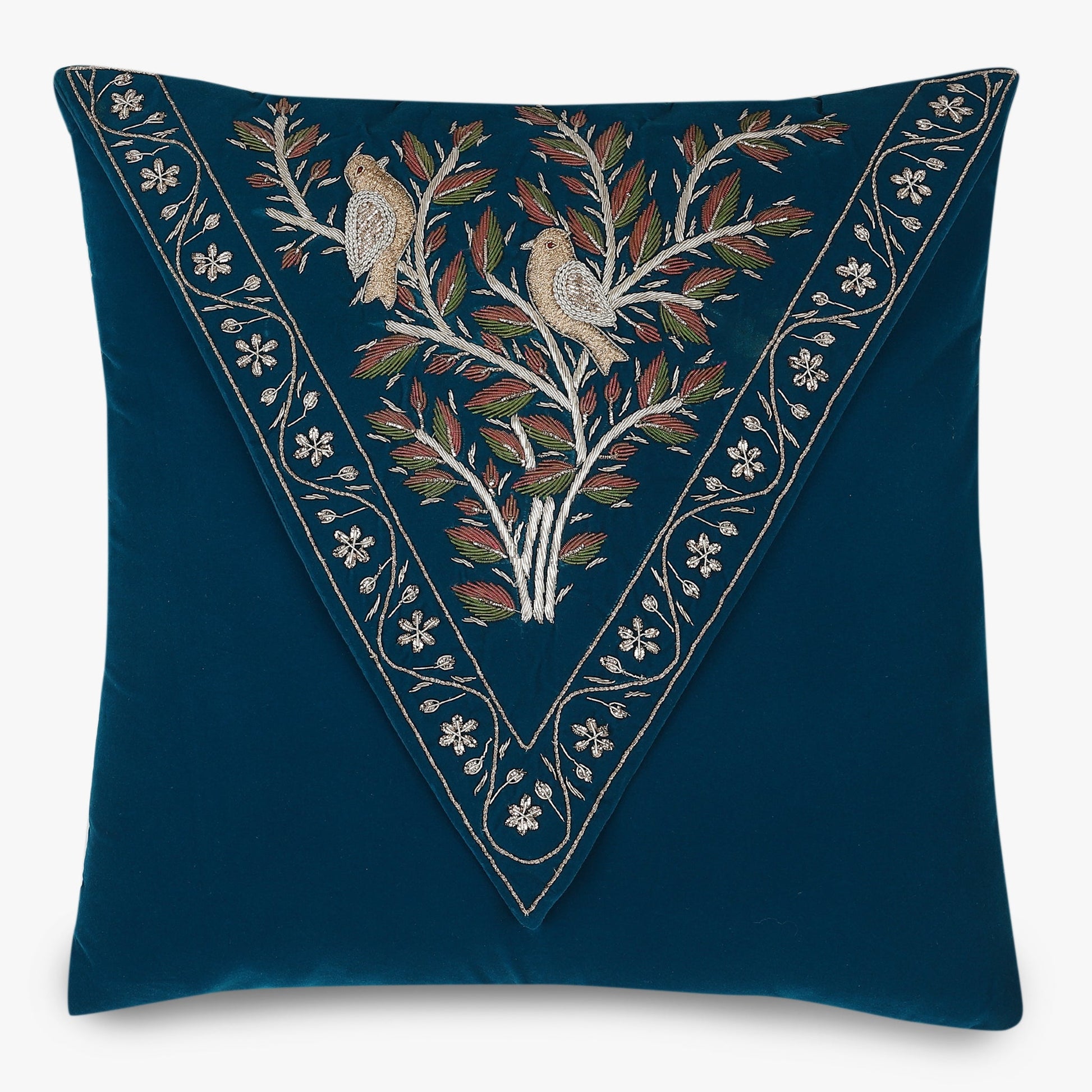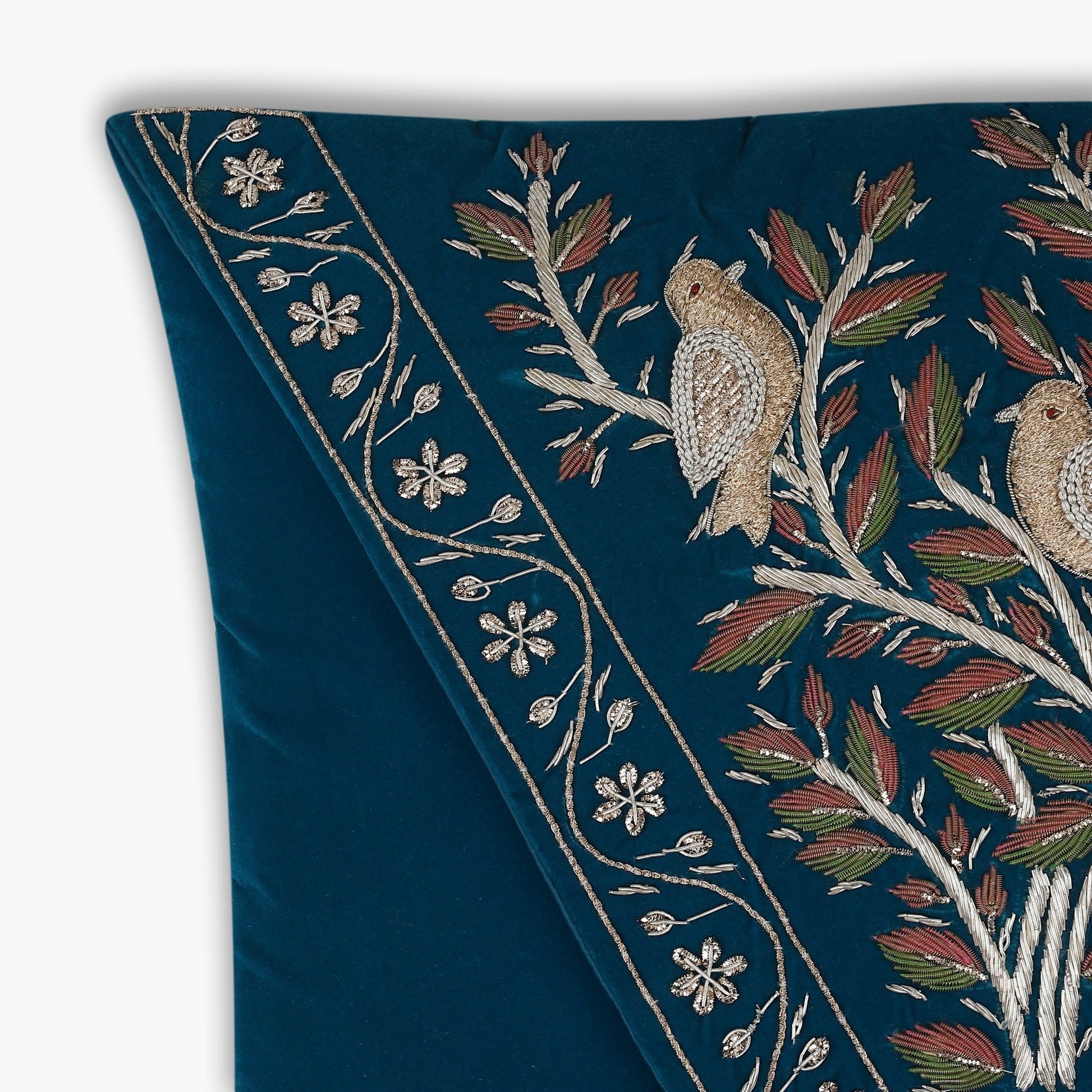 Opulence meets Craftsmanship // the Falak Turquoise Blue Velvet Cushion Cover is adorned with exquisite and intricate hand embroidered bird motifs. Each piece is a work of art that will transform your space into a palace of elegance and luxury. These exceptional pieces are one of a kind and crafted keeping in mind discerning Connoisseurs of Art, Where Every Piece Tells a Story of Craftsmanship and Beauty. Elevate Your Living Space with Timeless Elegance.