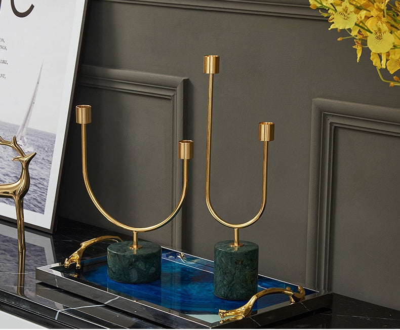 A set of 2 ‘U’ shaped candle holder covered in brushed gold supported with forest green marble stand.