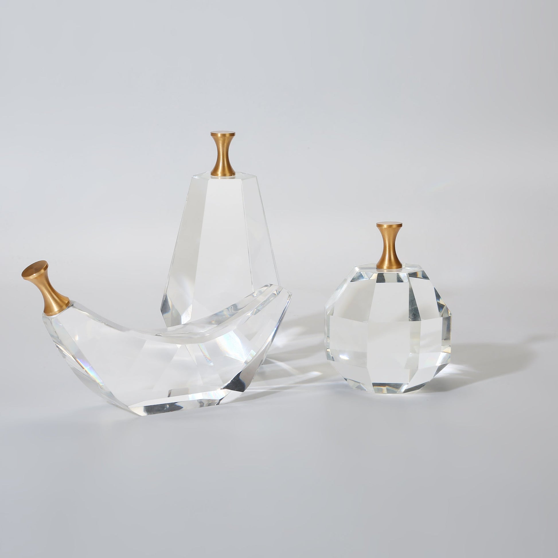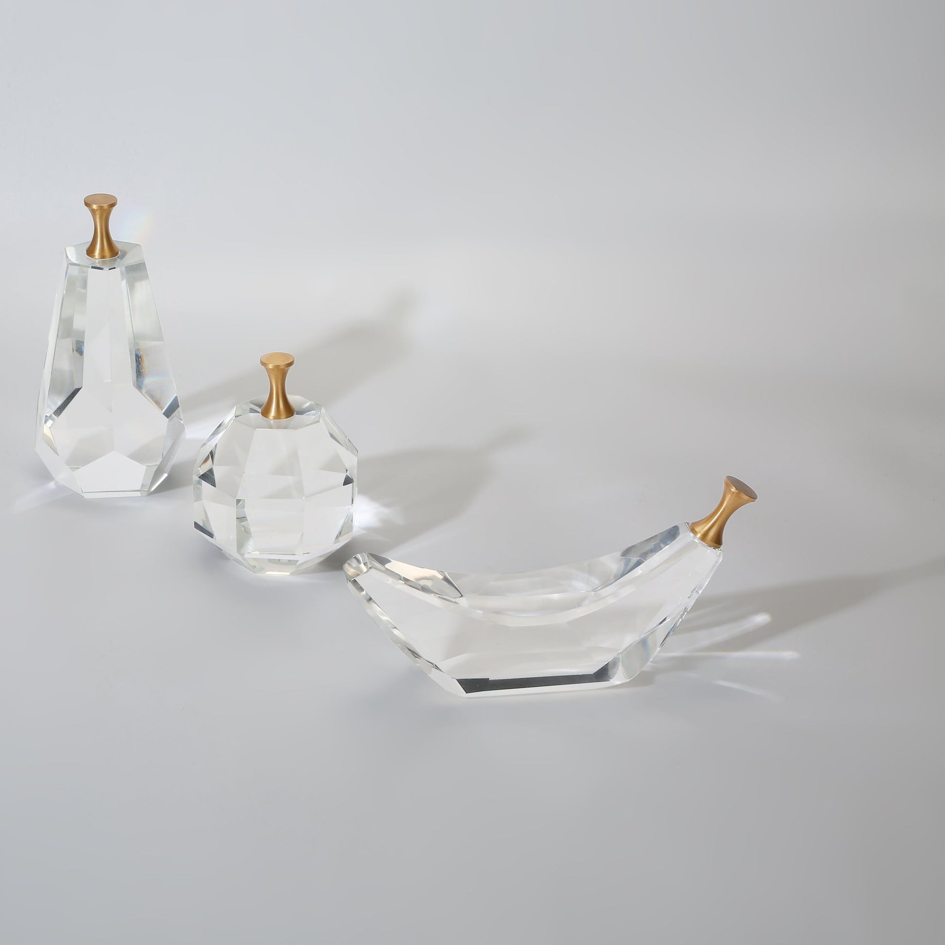 Each piece is a testament to the exquisite artistry of glass cutting, expertly capturing the essence of a ripe banana, a luscious apple, and a succulent pear. The intricate details and vibrant colors mirror the beauty of real fruits, lending an air of authenticity to these glass sculptures.