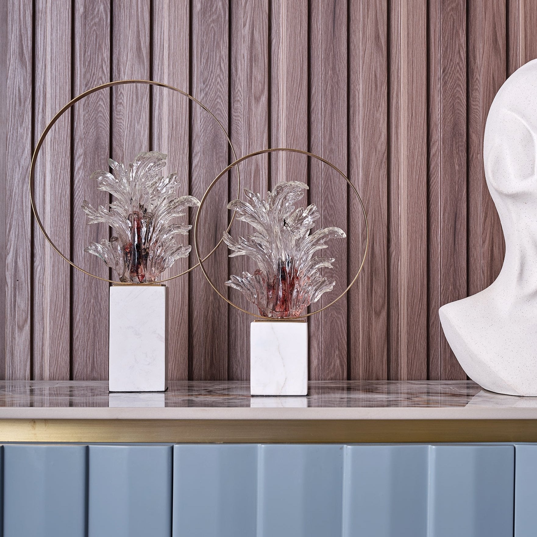 A luxurious set of sculpted metal rings encasing a delicate, ever-burning flame, gracefully positioned atop stunning polished white marble podiums. These elegant accents capture the primal beauty of fire within minimalist, modern design. Perfect for bringing a warm, creative aura to any space, while exuding a refined sense of art and luxury.