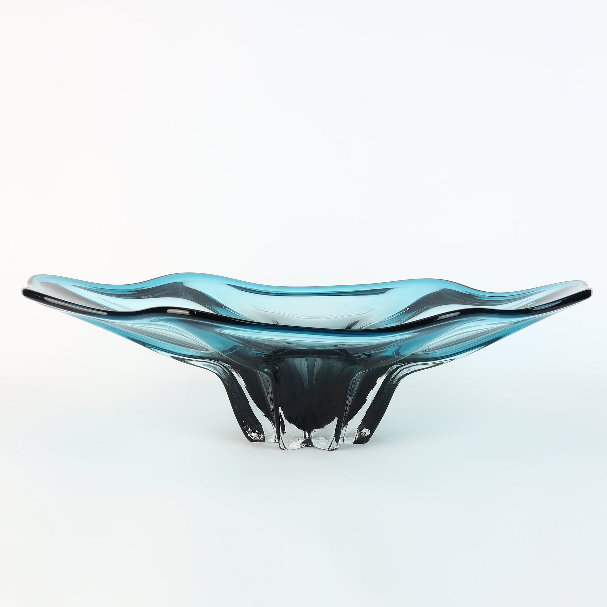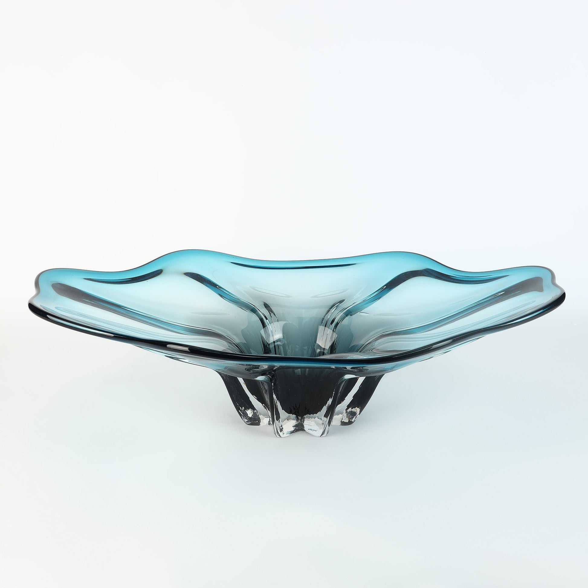 This stunning décor platter, crafted from clear and acqua glass, is a masterpiece of design. Featuring a beautifully ribbed texture and an abstract shape that mimics the delicate bloom of a flower, its unique form narrows at the bottom and gracefully widens at the top. The mesmerizing gradient transitions from dark grey at the base to a soft blue at the top, creating a rich, dynamic visual effect.