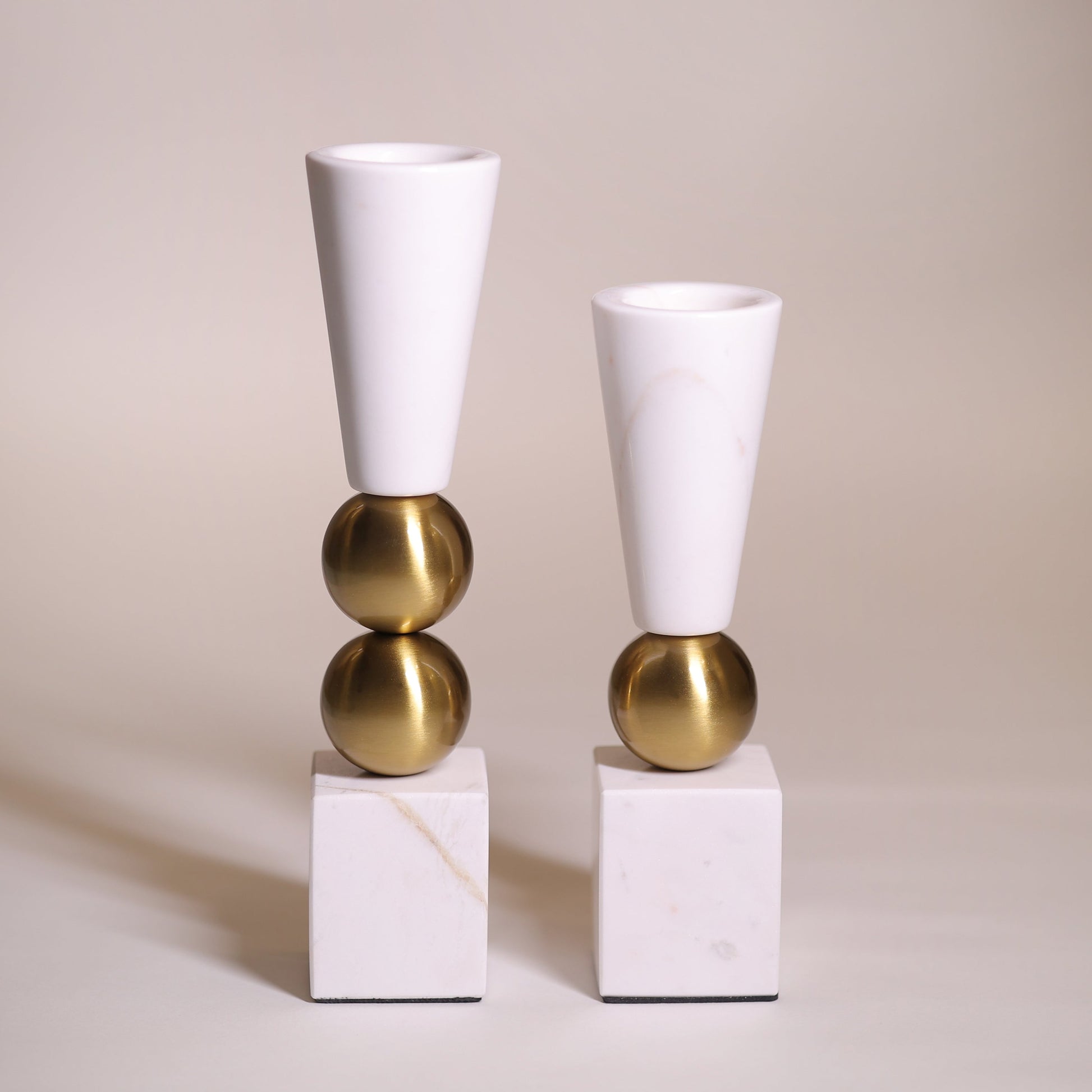 Our Marmor Candle Holders beautifully bring together two shapes of marble that are seamlessly divided by brushed gold metal balls on the neck of the candle stands. An amalgamation of contemporary design and classic material, these stunning candleholders are a minimalists dream come true. Expertly crafted, these candleholders are ideal to place on consoles and shelves to give a new life to your spaces.