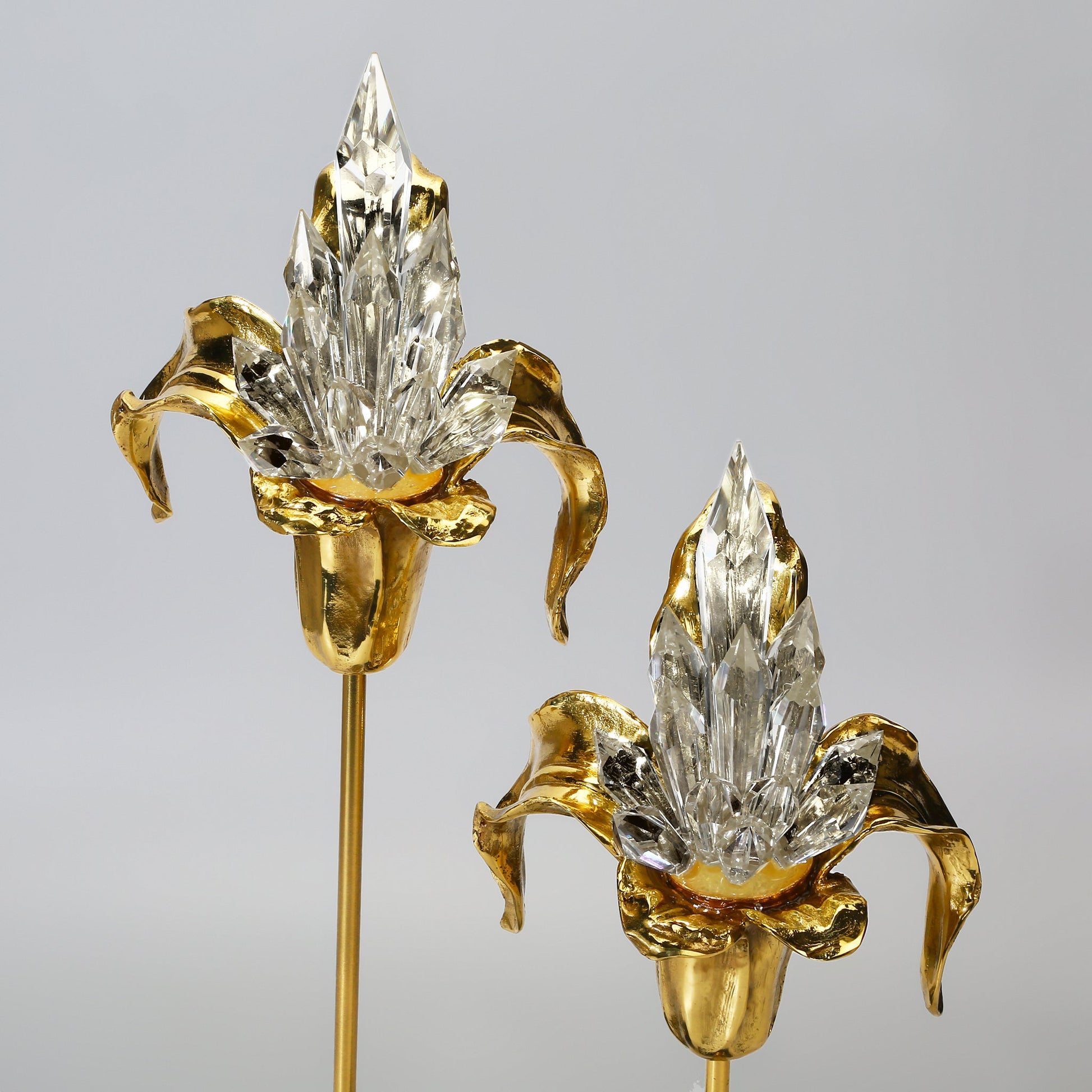 Two resplendent flower figurines meticulously crafted with exquisite precision and gilded in radiant gold, casting a warm and enchanting glow. Gracefully blooming, adorned with glistening crystals reflecting a flower in full bloom - the essence of nature's allure in every glimmer placed on top of exquisite lacquered black podiums.
