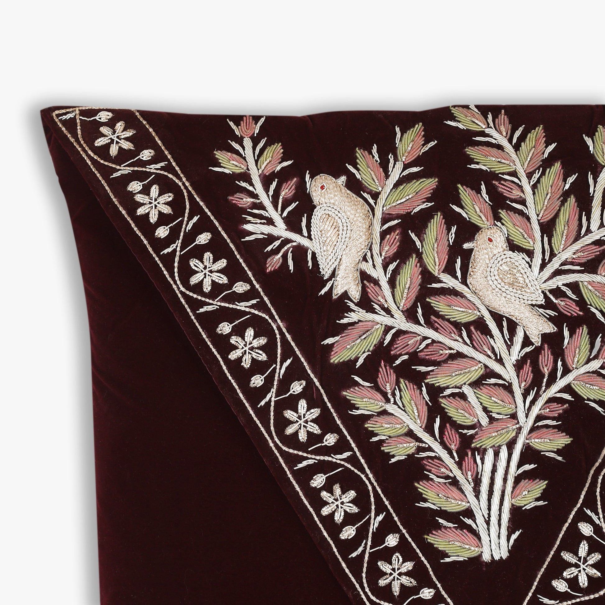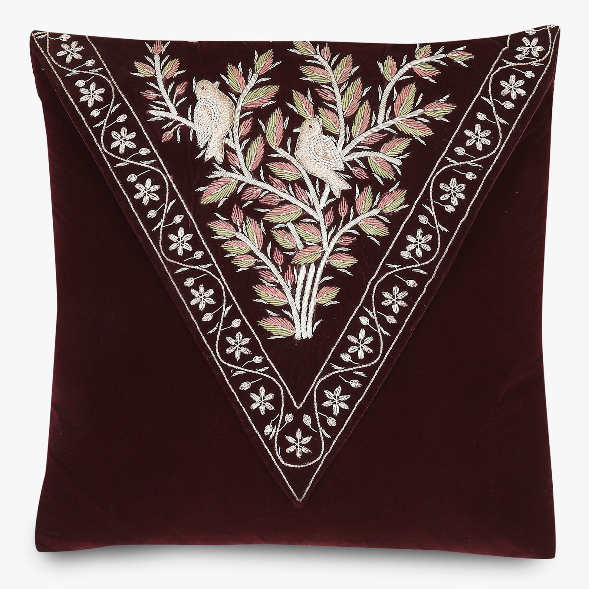 Opulence meets Craftsmanship // the Nazaara Burgundy Velvet Cushion Cover is adorned with exquisite and intricate hand embroidered bird motifs. Each piece is a work of art that will transform your space into a palace of elegance and luxury. These exceptional pieces are one of a kind and crafted keeping in mind discerning Connoisseurs of Art, Where Every Piece Tells a Story of Craftsmanship and Beauty. Elevate Your Living Space with Timeless Elegance.