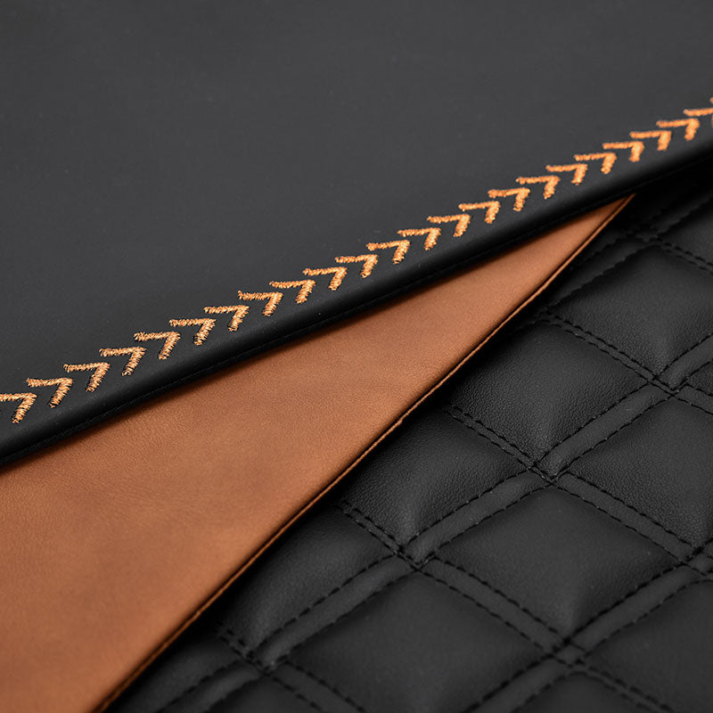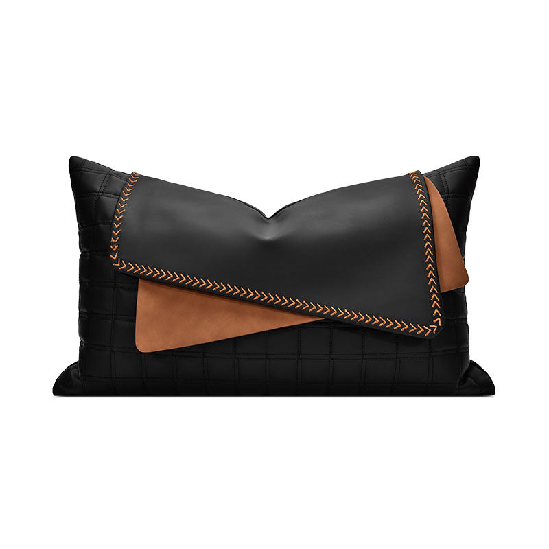 Transform your living space with the understated elegance of our Onyx Rectangular Cushion Cover. Crafted from the finest materials, this cushion cover features a rich play for varying textures, patterns and materials. The rich black is enhanced with a patch of orange PU and a stitch detail that covers the flap exuding luxury and sophistication, making it an ideal accent piece for contemporary interiors.