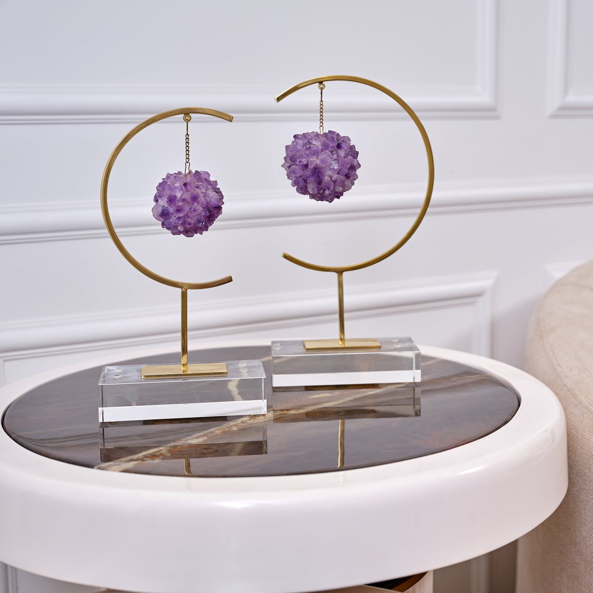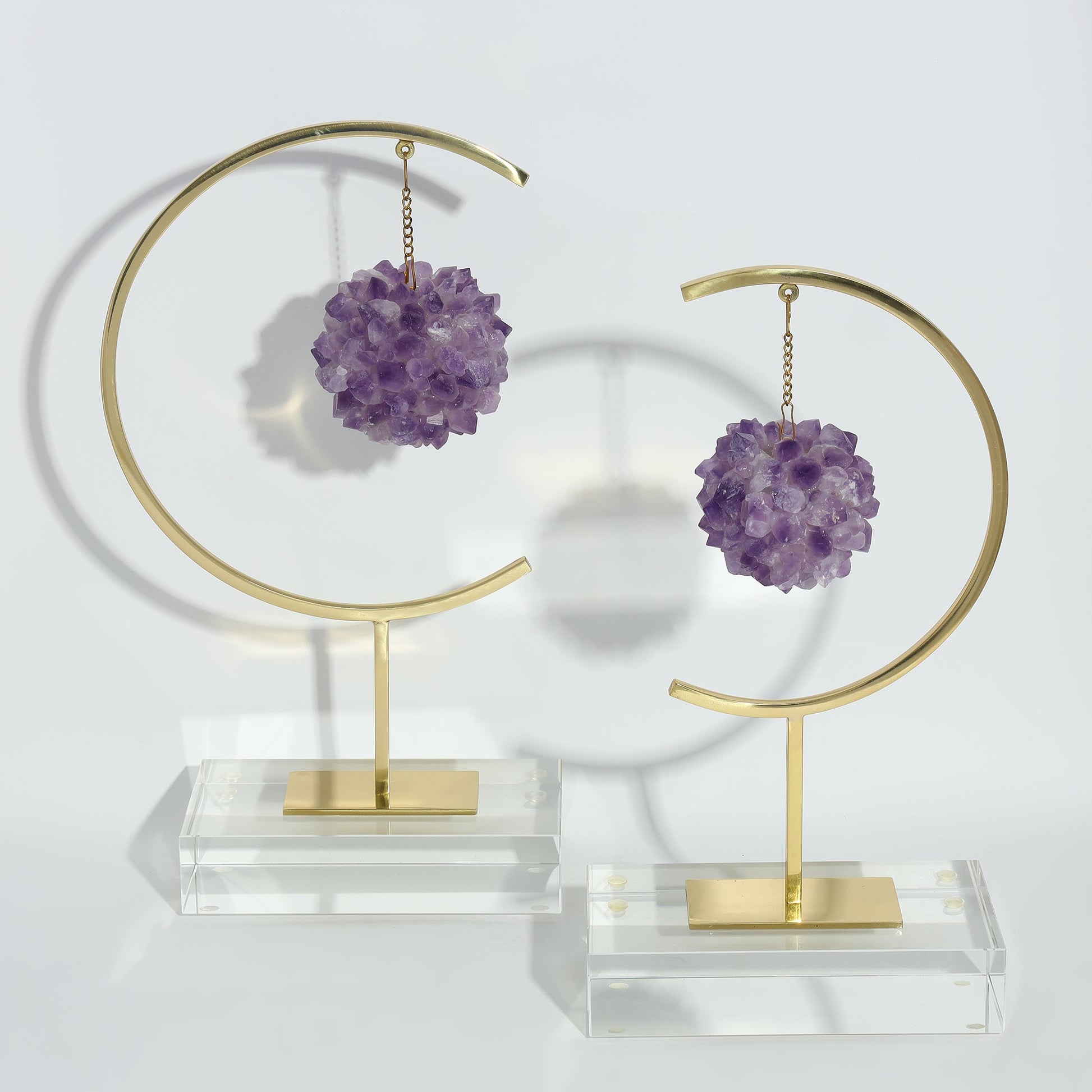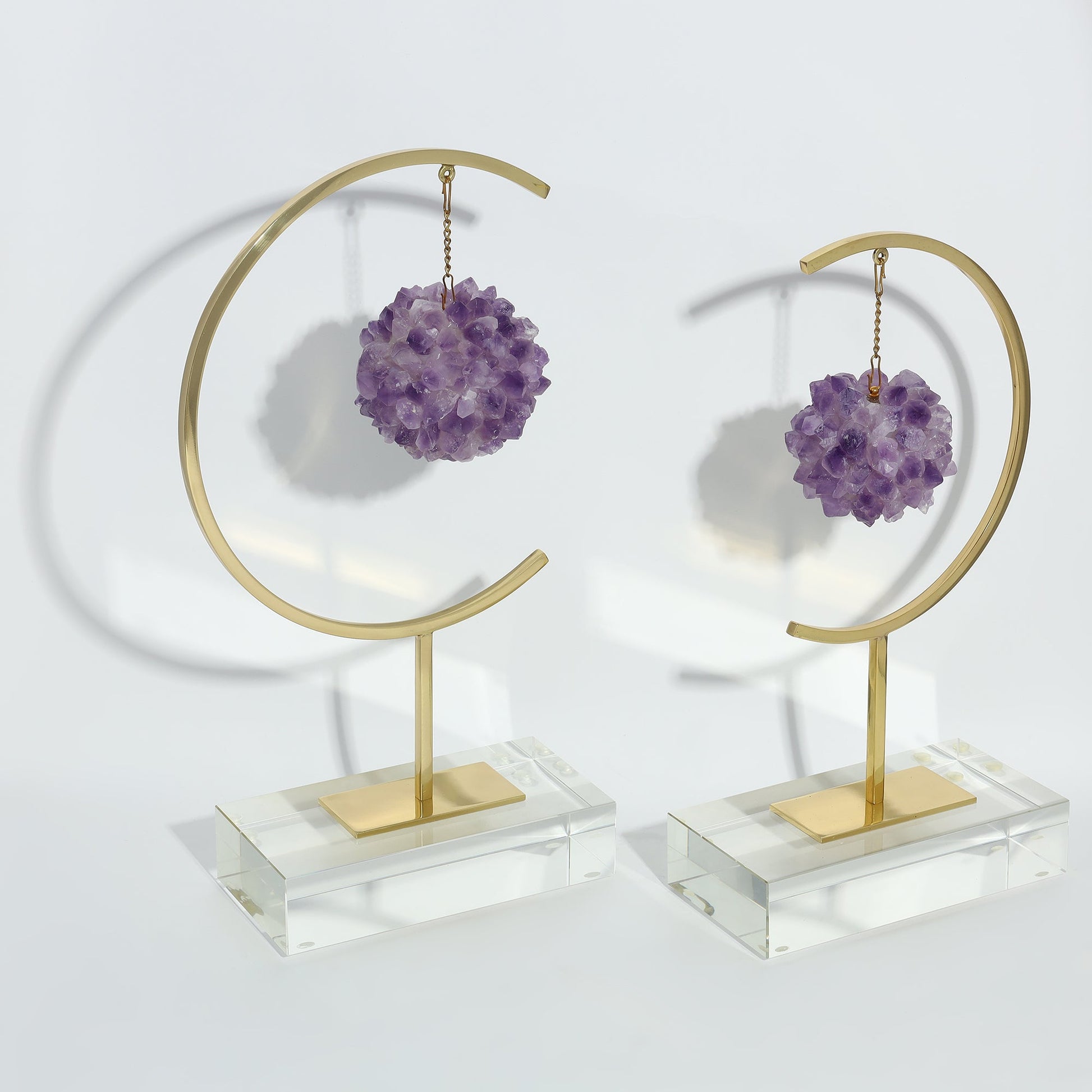 Introduce a touch of modern elegance to your home with this exquisite set of two sculptures. Featuring a sleek glass base and a refined metal body, each piece is adorned with a dangling amethyst cluster, creating a harmonious blend of contemporary design and timeless luxury.