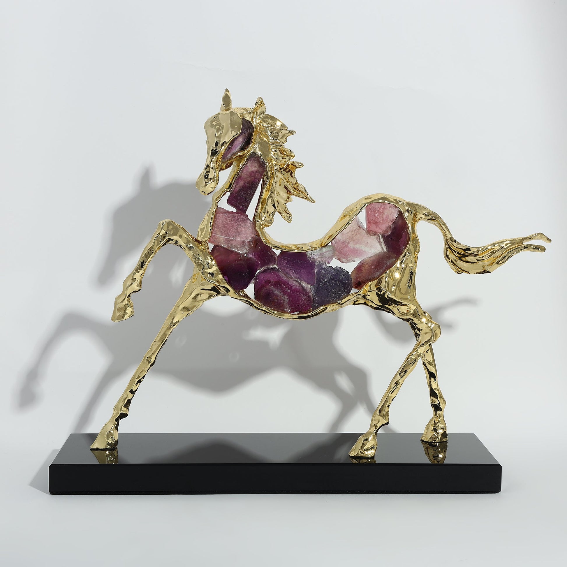 Introducing the Valor Amethyst Sculpture, a stunning masterpiece that exudes charm and sophistication, designed to transform your living spaces into a haven of elegance. This grand sculpture features a majestic horse captured mid-stride adding a sense of movement and grace, embedded with Amethyst crystals.